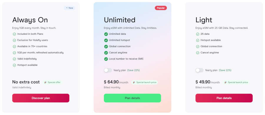 Holafly Plans: plano Light e plano Ilimitado